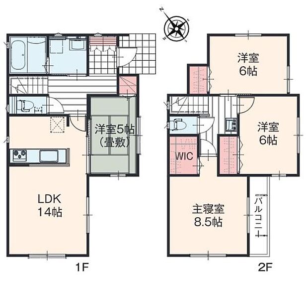 | 間取り | 4LDK 間取り内訳:リビングダイニングキッチン 14帖(1階)・和室 5畳(1階)・洋室 8.5帖(2階)・洋室 6帖(2階)・洋室 6帖(2階) |