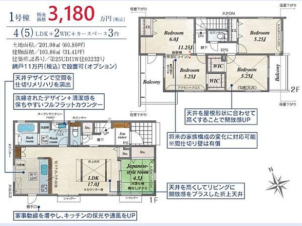 | 間取り | 4LDK 間取り内訳:リビングダイニングキッチン 17帖(1階)・和室 4.5畳(1階)・洋室 5.2帖(2階)・洋室 5.2帖(2階)・洋室 11.2帖(2階) |