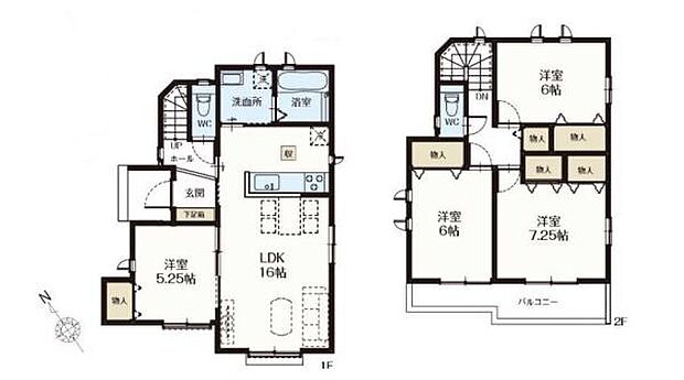 | 間取り | 4LDK 間取り内訳:リビングダイニングキッチン 16帖(1階)・洋室 5.2帖(1階)・洋室 7.2帖(2階)・洋室 6帖(2階)・洋室 6帖(2階) |