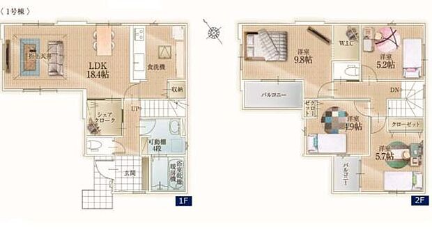 | 間取り | 4LDK 間取り内訳:リビングダイニングキッチン 18.4帖(1階)・洋室 9.8帖(2階)・洋室 5.7帖(2階)・洋室 5.2帖(2階)・洋室 4.9帖(2階) |
