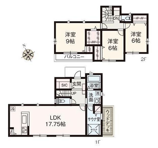 | 間取り | 3LDK 間取り内訳:リビングダイニングキッチン 17.7帖(1階)・洋室 9帖(2階)・洋室 6帖(2階)・洋室 6帖(2階) |
