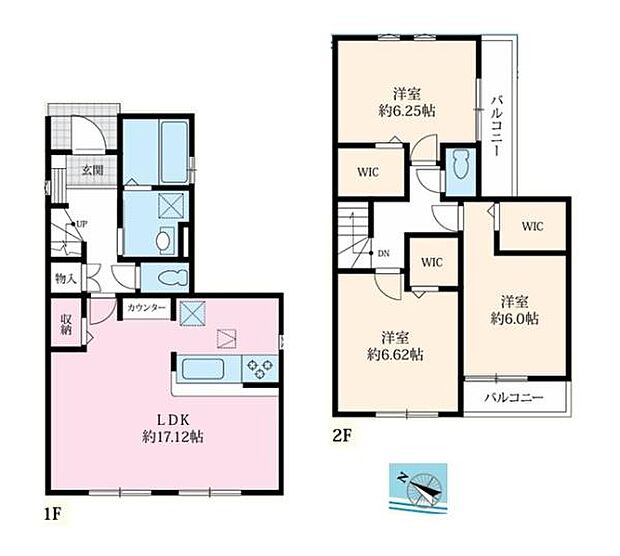 間取り内訳:リビングダイニングキッチン 17.1帖(1階)・洋室 6.2帖(2階)・洋室 6.6帖(2階)・洋室 6帖(2階)