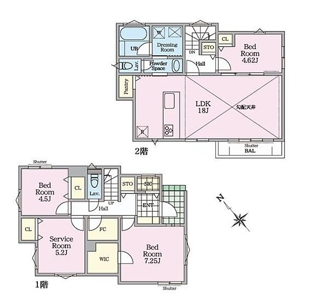 | 間取り | 3SLDK 間取り内訳:洋室 4.5帖(1階)・収納 5.2帖(1階)・洋室 7.2帖(1階)・洋室 4.6帖(2階)・リビングダイニングキッチン 18帖(2階) |