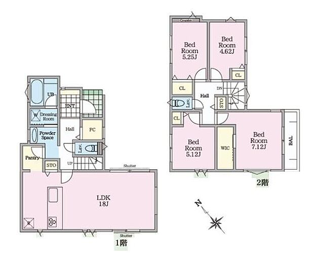 | 間取り | 4LDK 間取り内訳:リビングダイニングキッチン 18帖(1階)・洋室 5.1帖(2階)・洋室 7.1帖(2階)・洋室 4.6帖(2階)・洋室 5.2帖(2階) |