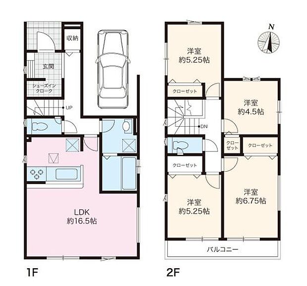 間取り内訳:リビングダイニングキッチン 16.5帖(1階)・洋室 5.2帖(2階)・洋室 6.7帖(2階)・洋室 4.5帖(2階)・洋室 5.2帖(2階)