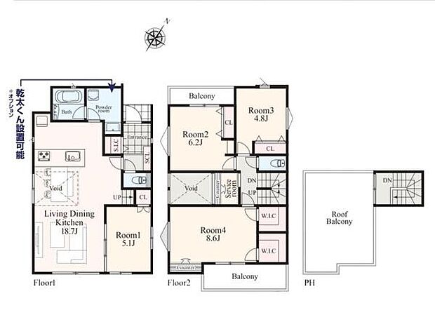 | 間取り | 4LDK 間取り内訳:リビングダイニングキッチン 18.7帖(1階)・洋室 5.1帖(1階)・洋室 4.8帖(2階)・洋室 6.2帖(2階)・洋室 8.6帖(2階) |