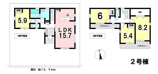 | 間取り | 4LDK 間取り内訳:洋室 6帖(2階)・洋室 8.2帖(2階)・リビングダイニングキッチン 15.7帖(1階)・洋室 5.9帖(1階)・洋室 5.4帖(2階) |