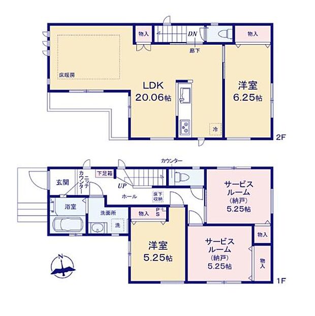間取り内訳:洋室 5.2帖(1階)・収納 5.2帖(1階)・収納 5.2帖(1階)・リビングダイニングキッチン 20帖(2階)・洋室 6.2帖(2階)