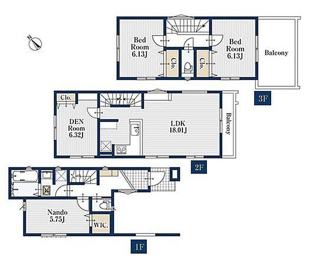 | 間取り | 2SLDK 間取り内訳:洋室 6.1帖(3階)・洋室 6.1帖(3階)・収納 5.7帖(1階)・リビングダイニングキッチン 18帖(2階)・収納 6.3帖(2階) |