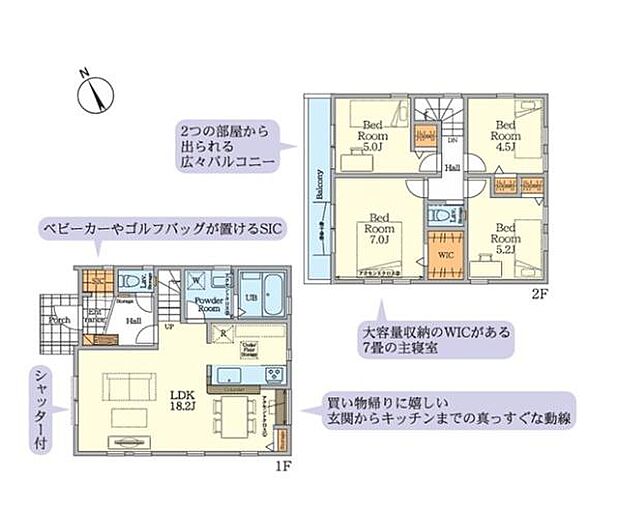 | 間取り | 4LDK 間取り内訳:リビングダイニングキッチン 18.2帖(1階)・洋室 5帖(2階)・洋室 7帖(2階)・洋室 5.2帖(2階)・洋室 4.5帖(2階) |