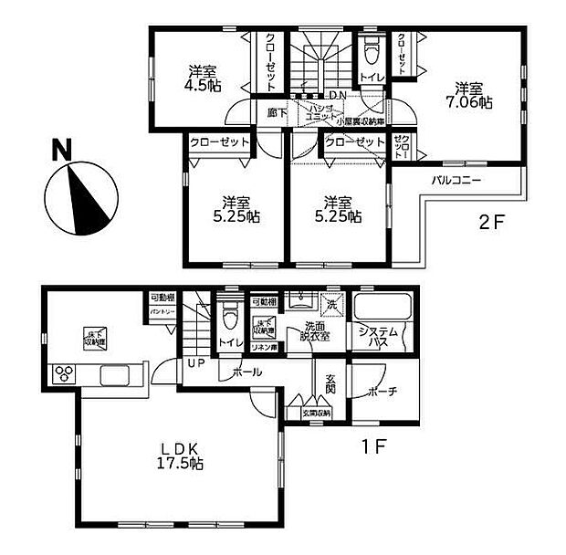| 間取り | 4LDK 間取り内訳:リビングダイニングキッチン 17.5帖(1階)・洋室 4.5帖(2階)・洋室 5.2帖(2階)・洋室 5.2帖(2階)・洋室 7帖(2階) |
