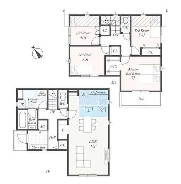 間取り内訳:リビングダイニングキッチン 17帖(1階)・洋室 4.5帖(2階)・洋室 5.5帖(2階)・洋室 7帖(2階)・洋室 5.3帖(2階)