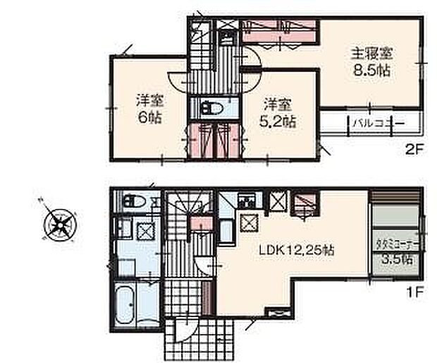 間取り内訳:リビングダイニングキッチン 12.2帖(1階)・和室 3.5畳(1階)・洋室 8.5帖(2階)・洋室 6帖(2階)・洋室 5.2帖(2階)