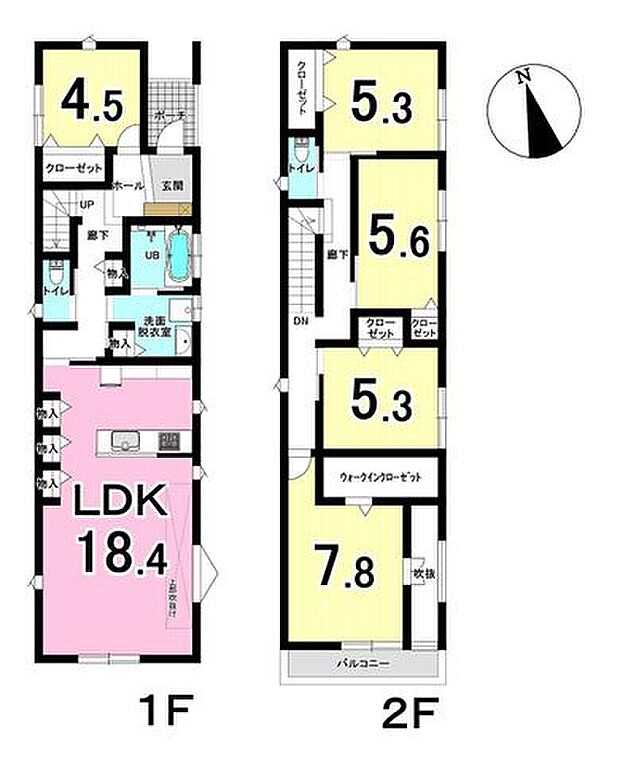 | 間取り | 5LDK 間取り内訳:リビングダイニングキッチン 18.4帖・洋室 4.5帖・洋室 5.3帖・洋室 5.6帖・洋室 5.3帖・洋室 7.8帖 |