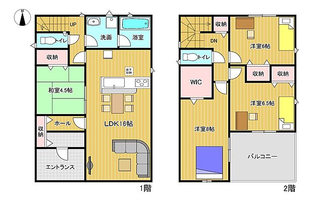 | 間取り | 4LDK 間取り内訳:リビングダイニングキッチン 16帖(1階)・和室 4.5畳(1階)・洋室 8帖(2階)・洋室 6.5帖(2階)・洋室 6帖(2階) |