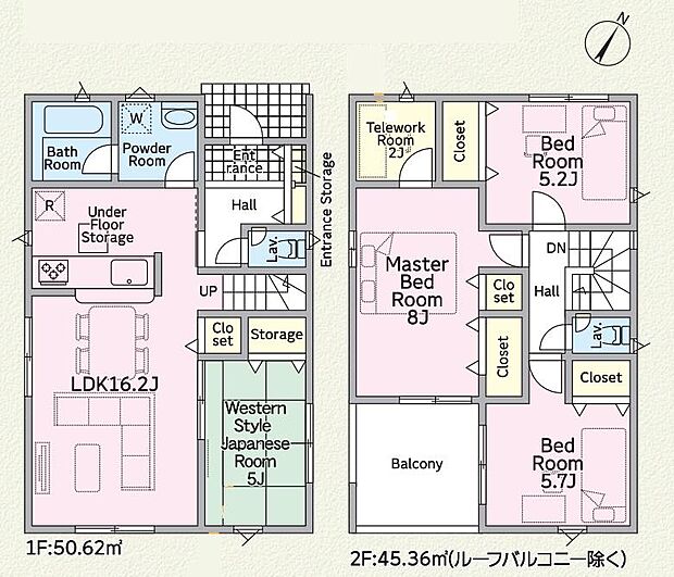 | 間取り | 4LDK 間取り内訳:リビングダイニングキッチン 16.2帖(1階)・和室 4.5畳(1階)・洋室 5.7帖(2階)・洋室 8帖(2階)・洋室 5.2帖(2階) |