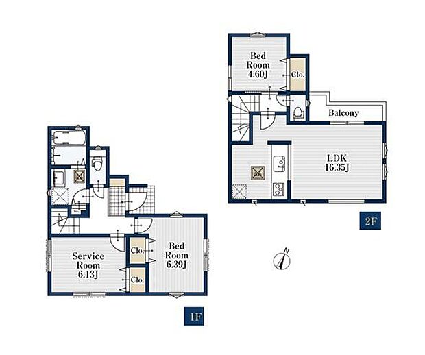 | 間取り | 2SLDK 間取り内訳:洋室 6.3帖(1階)・収納 6.1帖(1階)・リビングダイニングキッチン 16.3帖(2階)・洋室 4.6帖(2階) |