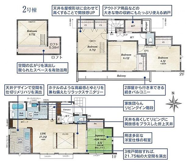 全42棟の開発分譲地。全居室南向き。リビング階段。ロフト、納戸。リラックスサニタリー。駐車並列2台可(車種による)。