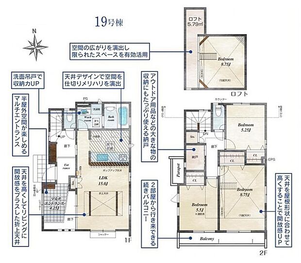 全42棟の開発分譲地。南道路面。半屋外空間が楽しめるマルチエントランス。水廻り集中。ロフト、納戸。駐車2台可(車種による)。