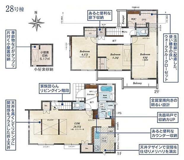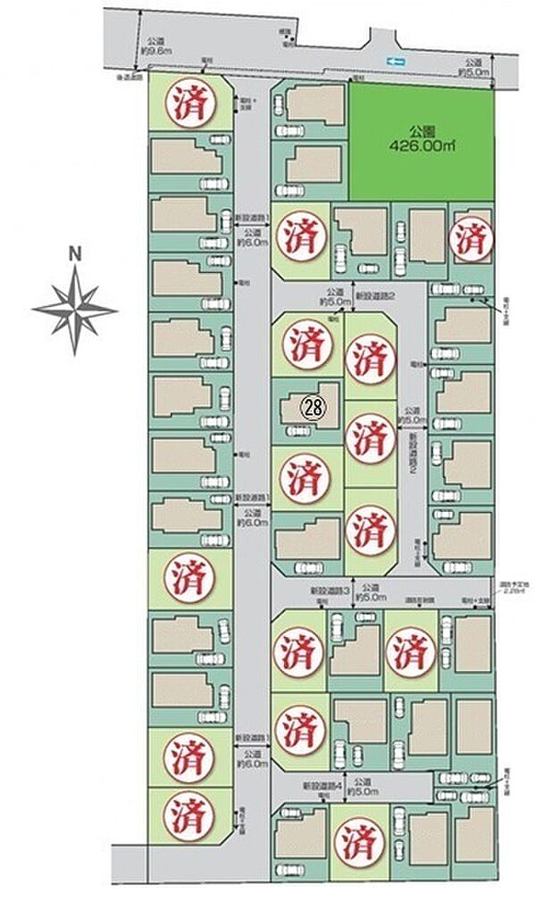 全42棟の開発分譲地。全居室南向き。リビング階段。2way洗面室。ウォークスルークローゼット。駐車2台可(車種による)。