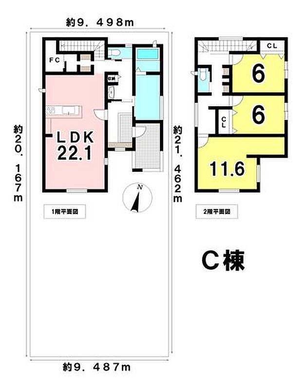 間取り内訳:リビングダイニングキッチン 22.1帖(1階)・洋室 11.6帖(2階)・洋室 6帖(2階)・洋室 6帖(2階)