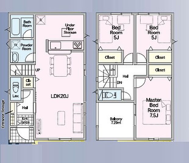 | 間取り | 3LDK 間取り内訳:洋室 5帖(2階)x2・リビングダイニングキッチン 20帖(1階)・洋室 7.5帖(2階) |