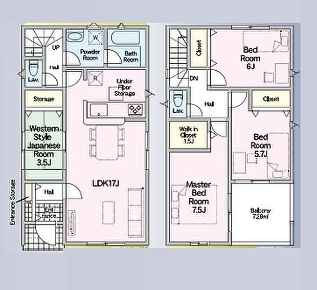 | 間取り | 4LDK 間取り内訳:洋室 6帖(2階)・洋室 5.7帖(2階)・和室 3.5畳(1階)・リビングダイニングキッチン 17帖(1階)・洋室 7.5帖(2階) |