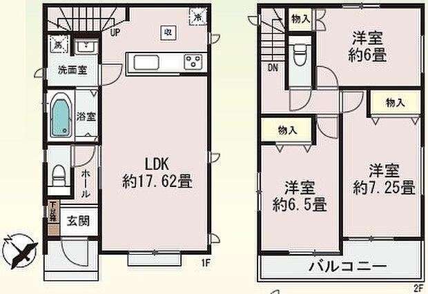 | 間取り | 3LDK 間取り内訳:リビングダイニングキッチン(1階)・洋室 7.2帖(2階)・洋室 6.5帖(2階)・洋室 6帖(2階) |