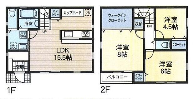 間取り内訳:リビングダイニングキッチン 15.5帖(1階)・洋室 8帖(2階)・洋室 6帖(2階)・洋室 4.5帖(2階)