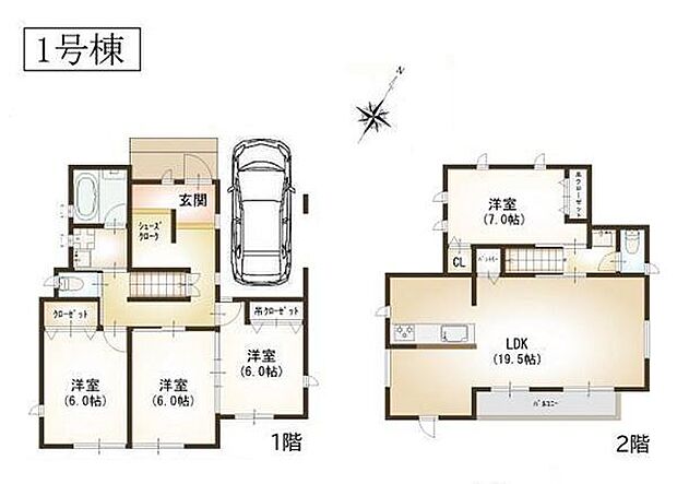 | 間取り | 4LDK 間取り内訳:洋室 6帖(1階)・洋室 6帖(1階)・洋室 6帖(1階)・リビングダイニングキッチン 19.5帖(2階)・洋室 7帖(2階) |