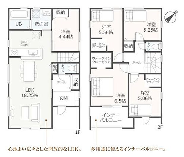| 間取り | 5LDK 間取り内訳:リビングダイニングキッチン 18.2帖(1階)・洋室 4.4帖(1階)・洋室 5.5帖(2階)・洋室 5.2帖(2階)・洋室 6.5帖(2階)・洋室 5帖(2階) |