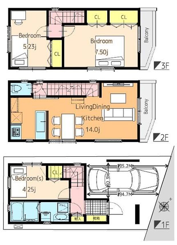 | 間取り | 2SLDK 間取り内訳:収納 4.2帖(1階)・リビングダイニングキッチン 14帖(2階)・洋室 5.2帖(3階)・洋室 7.5帖(3階) |