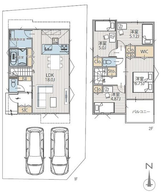 | 間取り | 4LDK 間取り内訳:リビングダイニングキッチン 18帖(1階)・洋室 5帖(2階)・洋室 4.8帖(2階)・洋室 6.7帖(2階)・洋室 5.1帖(2階) |