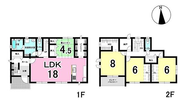 | 間取り | 4SLDK 間取り内訳:リビングダイニングキッチン 18帖(1階)・和室 4.5畳(1階)・洋室 8帖(2階)・洋室 6帖(2階)・洋室 6帖(2階) |