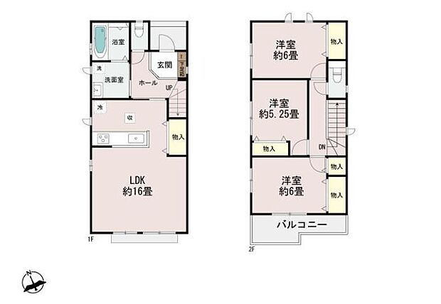 | 間取り | 3LDK 間取り内訳:リビングダイニングキッチン 16帖(1階)・洋室 6帖(2階)・洋室 5.2帖(2階)・洋室 6帖(2階) |