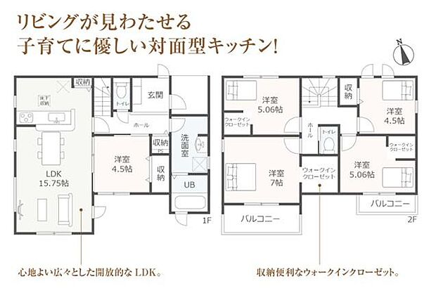 間取り内訳:リビングダイニングキッチン 15.7帖(1階)・洋室 4.5帖(1階)・洋室 5帖(2階)・洋室 7帖(2階)・洋室 4.5帖(2階)・洋室 5帖(2階)