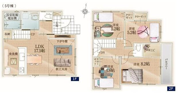 | 間取り | 4LDK 間取り内訳:リビングダイニングキッチン 17.5帖(1階)・洋室 8.2帖(2階)・洋室 5.2帖(2階)・洋室 5.2帖(2階)・洋室 4.8帖(2階) |
