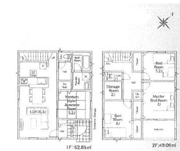 | 間取り | 4SLDK 間取り内訳:リビングダイニングキッチン 16.3帖(1階)・和室 5.2畳(1階)・洋室 7帖(2階)・洋室 5.2帖(2階)・洋室 5帖(2階)・収納 2帖(2階) |