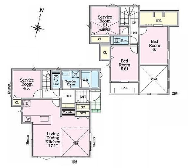 | 間取り | 2SLDK 間取り内訳:リビングダイニングキッチン 17.1帖(1階)・収納 4.5帖(1階)・収納 5帖(2階)・洋室 5.6帖(2階)・洋室 6帖(2階) |
