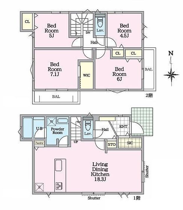| 間取り | 4LDK 間取り内訳:リビングダイニングキッチン 18.3帖(1階)・洋室 5帖(2階)・洋室 7.1帖(2階)・洋室 6帖(2階)・洋室 4.5帖(2階) |
