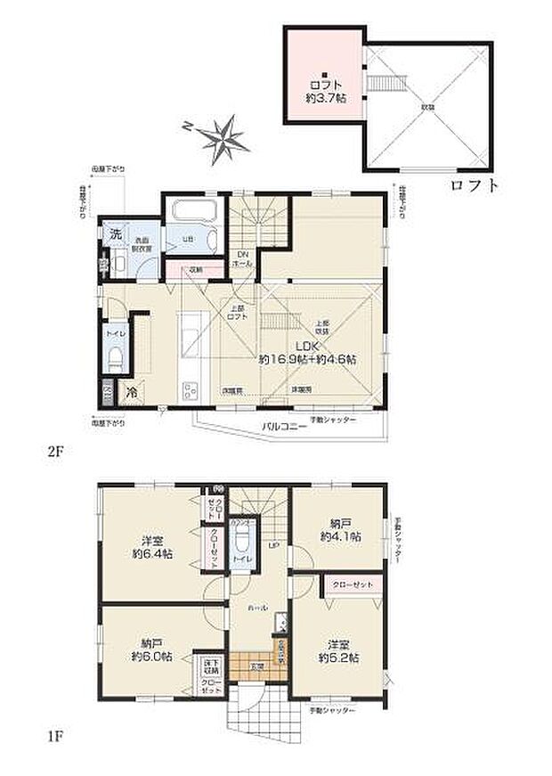 | 間取り | 2SLDK 間取り内訳:洋室 6.4帖(1階)・収納 6帖(1階)・洋室 5.2帖(1階)・収納 4.1帖(1階)・リビングダイニングキッチン 21.5帖(2階) |