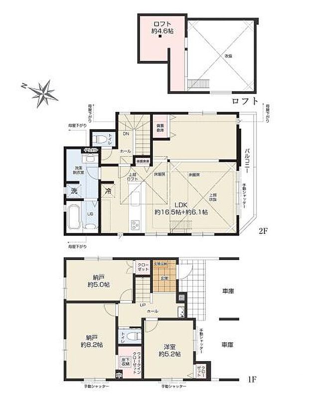 | 間取り | 1SLDK 間取り内訳:収納 5帖(1階)・収納 8.2帖(1階)・洋室 5.2帖(1階)・リビングダイニングキッチン 22.6帖(2階) |