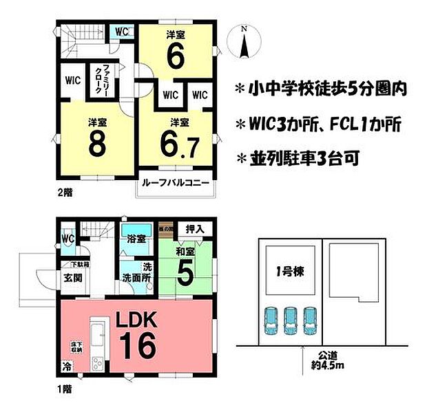 ■小中学校徒歩5分圏内■WIC3か所、FCL1か所あり■近隣バス停徒歩約3分■並列駐車3台可■整形地
