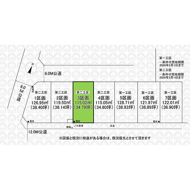 • 「建築条件付き土地」とは、一定期間内(概ね3ヶ月程度)に特定の建設会社と建築請負契約を結ぶことを 条件にしている宅地のことです。