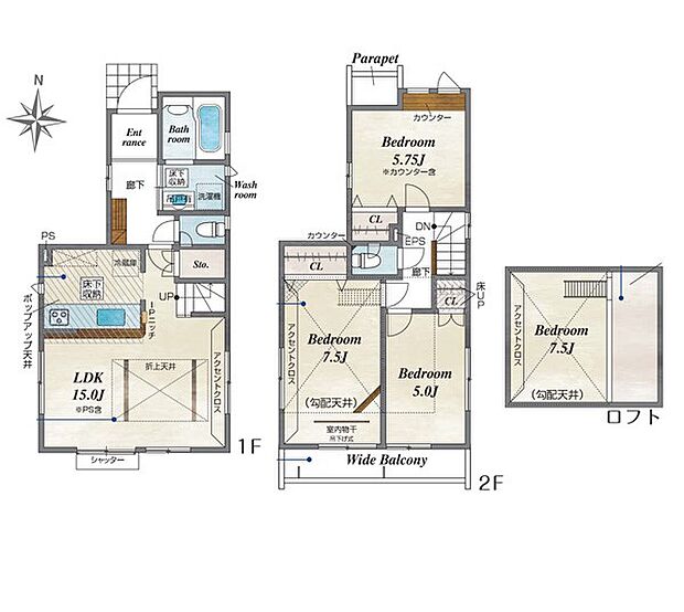 • 「建築条件付き土地」の「建物プラン例」は、土地購入者の設計プランの一例であり、プランの採用可否は任意です。