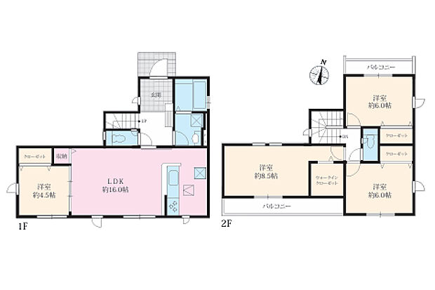 間取り内訳:リビングダイニングキッチン 16帖(1階)・洋室 4.5帖(1階)・洋室 8.5帖(2階)・洋室 6帖(2階)x2