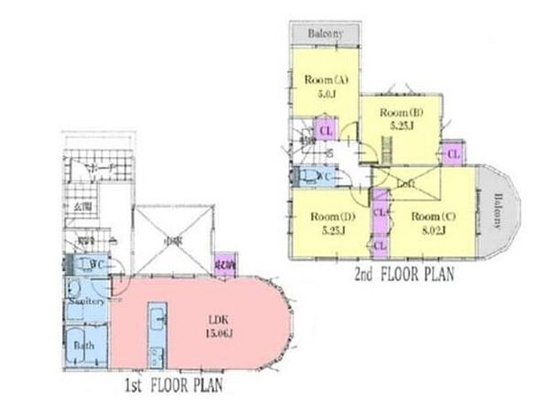 | 間取り | 4LDK 間取り内訳:リビングダイニングキッチン 15帖(1階)・洋室 5帖(2階)・洋室 5.2帖(2階)・洋室 5.2帖(2階)・洋室 8帖(2階) |