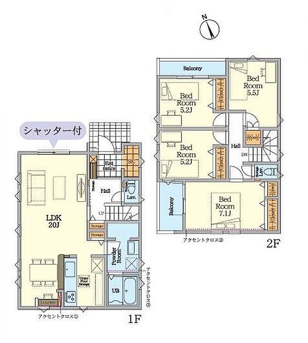 | 間取り | 4LDK 間取り内訳:リビングダイニングキッチン 20帖(1階)・洋室 5.2帖(2階)・洋室 5.2帖(2階)・洋室 7.1帖(2階)・洋室 5.5帖(2階) |