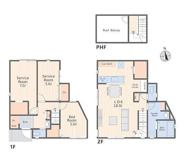 | 間取り | 1SLDK 間取り内訳:収納 5.6帖(1階)・洋室 5.6帖(1階)・リビングダイニングキッチン 18.9帖(2階)・収納 7.5帖(1階) |