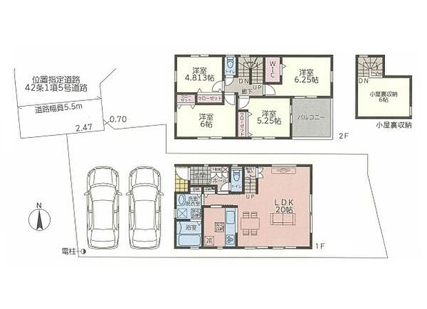 間取り内訳:リビングダイニングキッチン 20帖(1階)・洋室 4.8帖(2階)・洋室 6帖(2階)・洋室 5.2帖(2階)・洋室 6.2帖(2階)